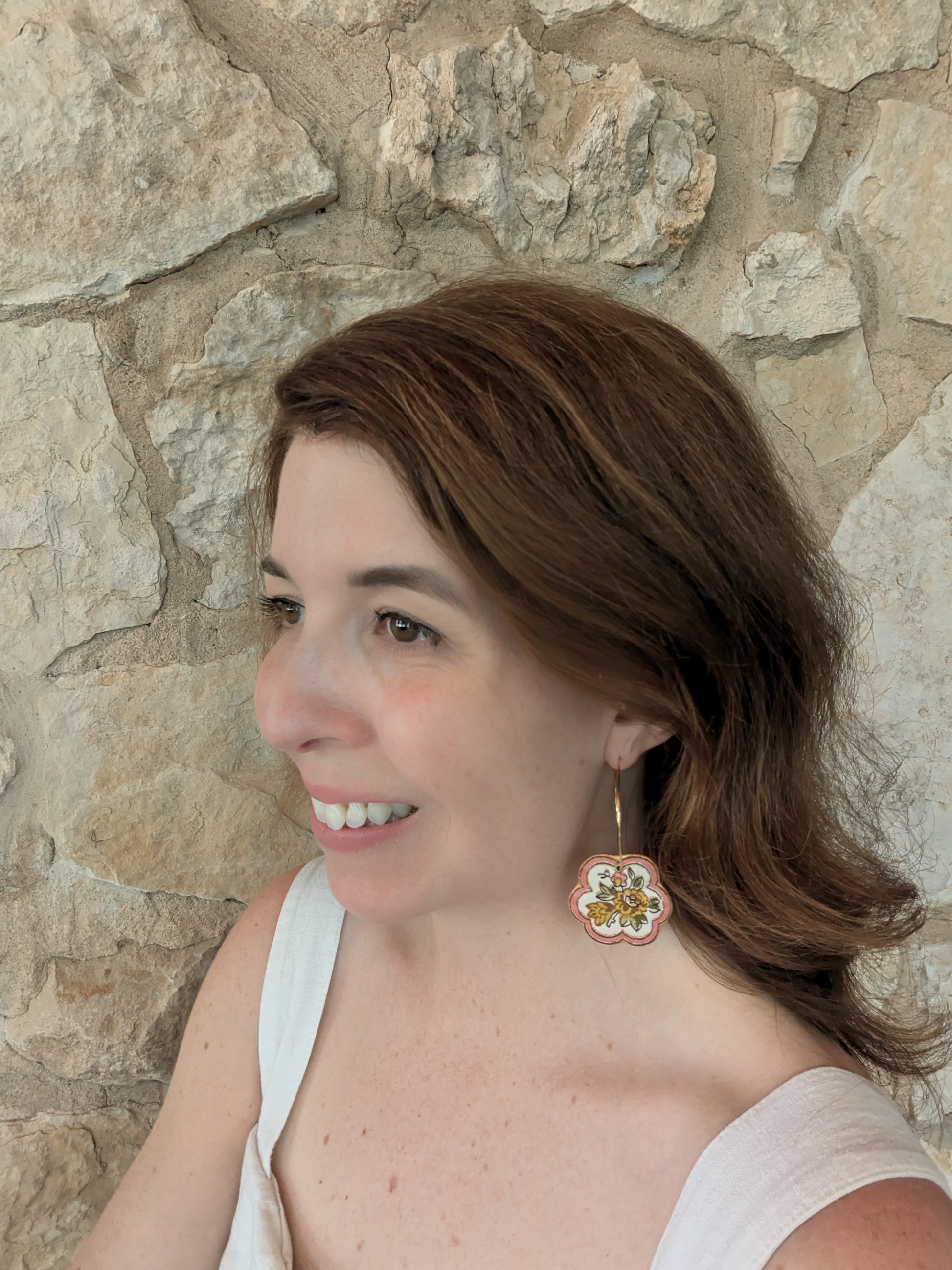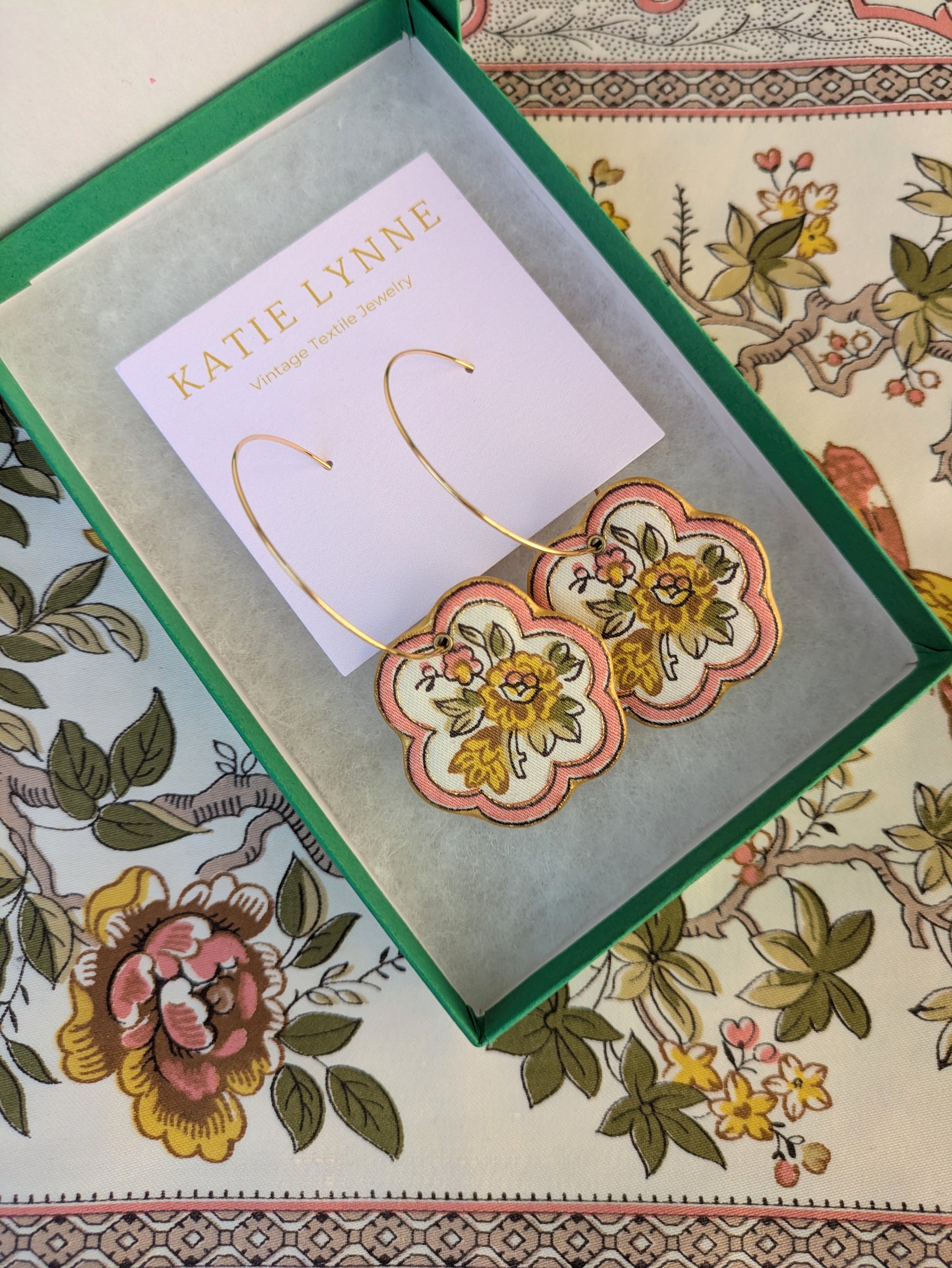The Daphne Hoop Earring was made using vintage fabric from Gahanna, Ohio. Each earring piece was handsewn, hand cut, and hand painted at the Katie Lynne studio in San Antonio, Texas.