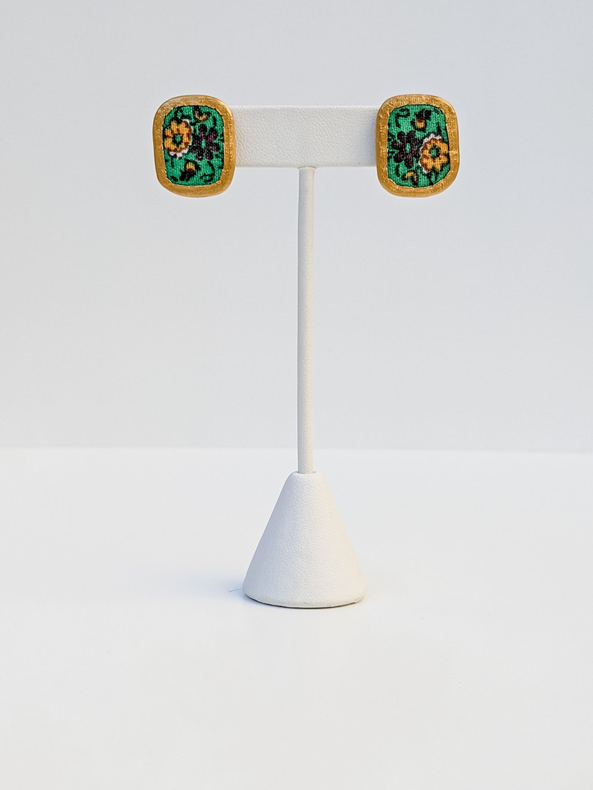 The Alexandra Stud Earring was made using 1970's folk printed fabric from Moscow, Russia. Each earring piece was handsewn, hand cut, and hand painted at the Katie Lynne studio in San Antonio, Texas.