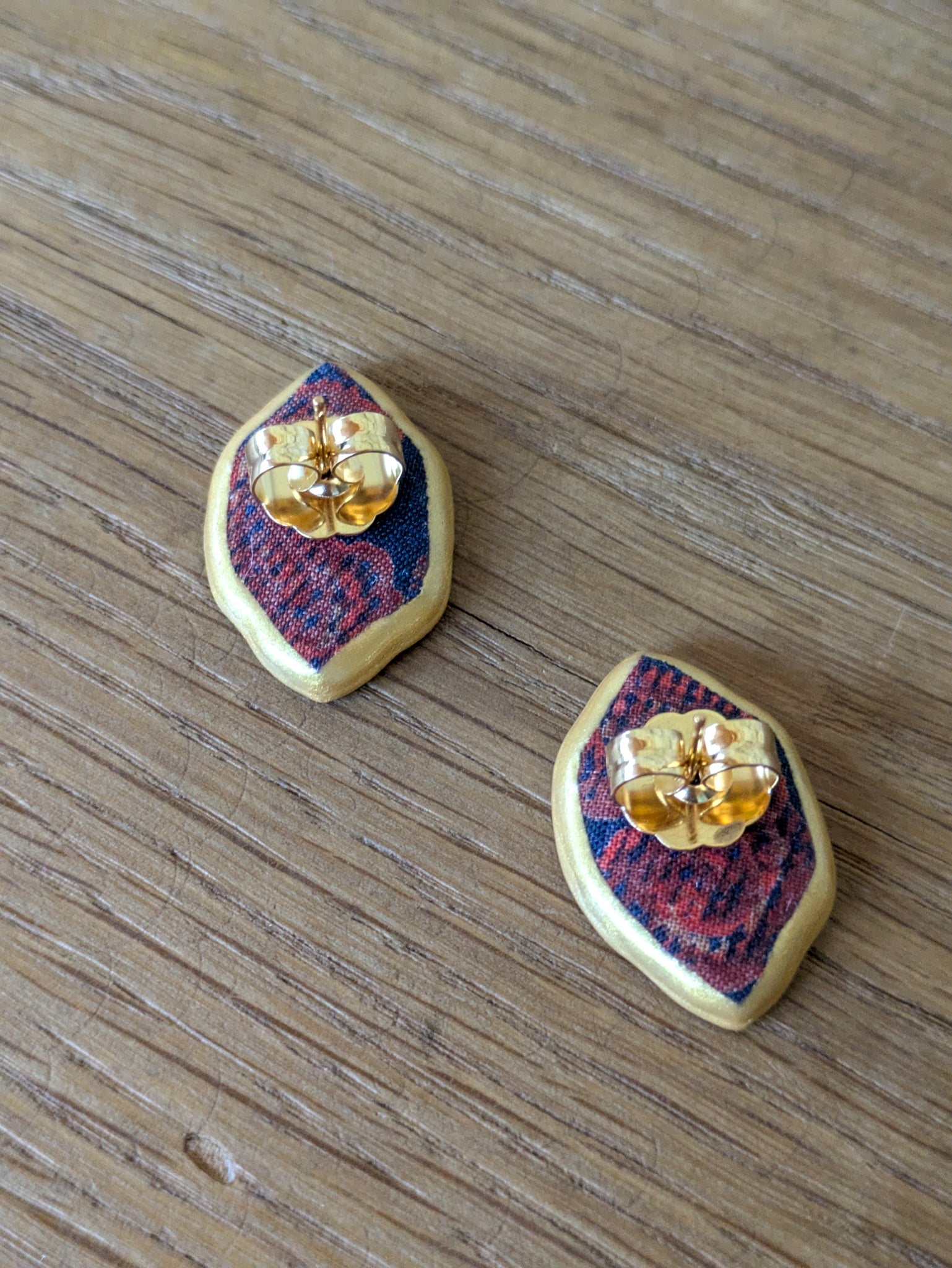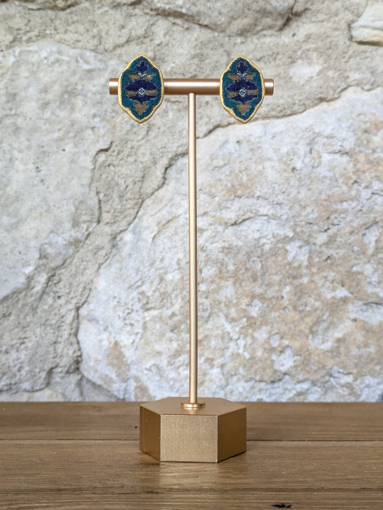 The Catherine Stud Earring was made using vintage fabric from Katy, Texas. Each earring piece was handsewn, hand cut, and hand painted at the Katie Lynne studio in San Antonio, Texas.
