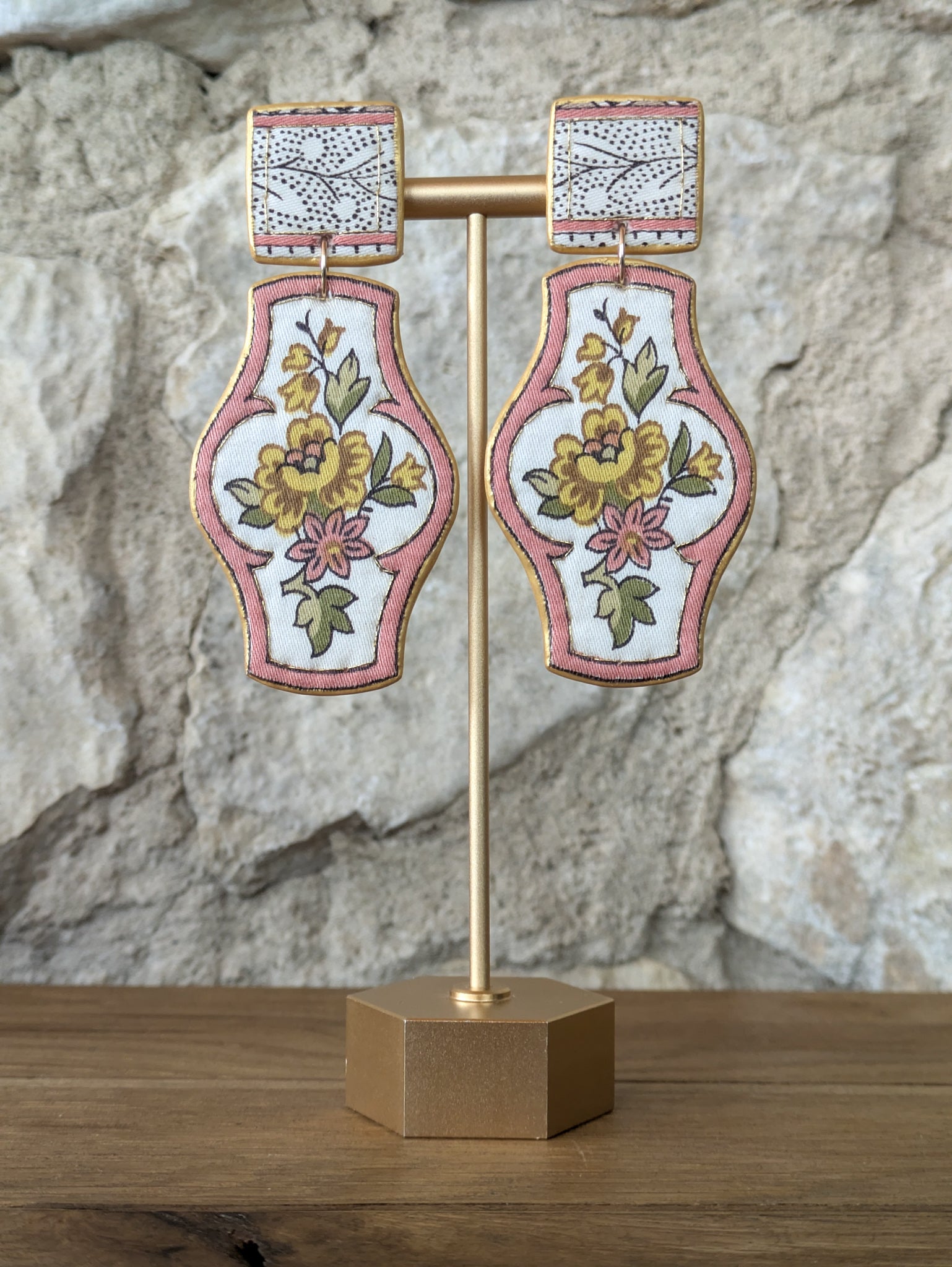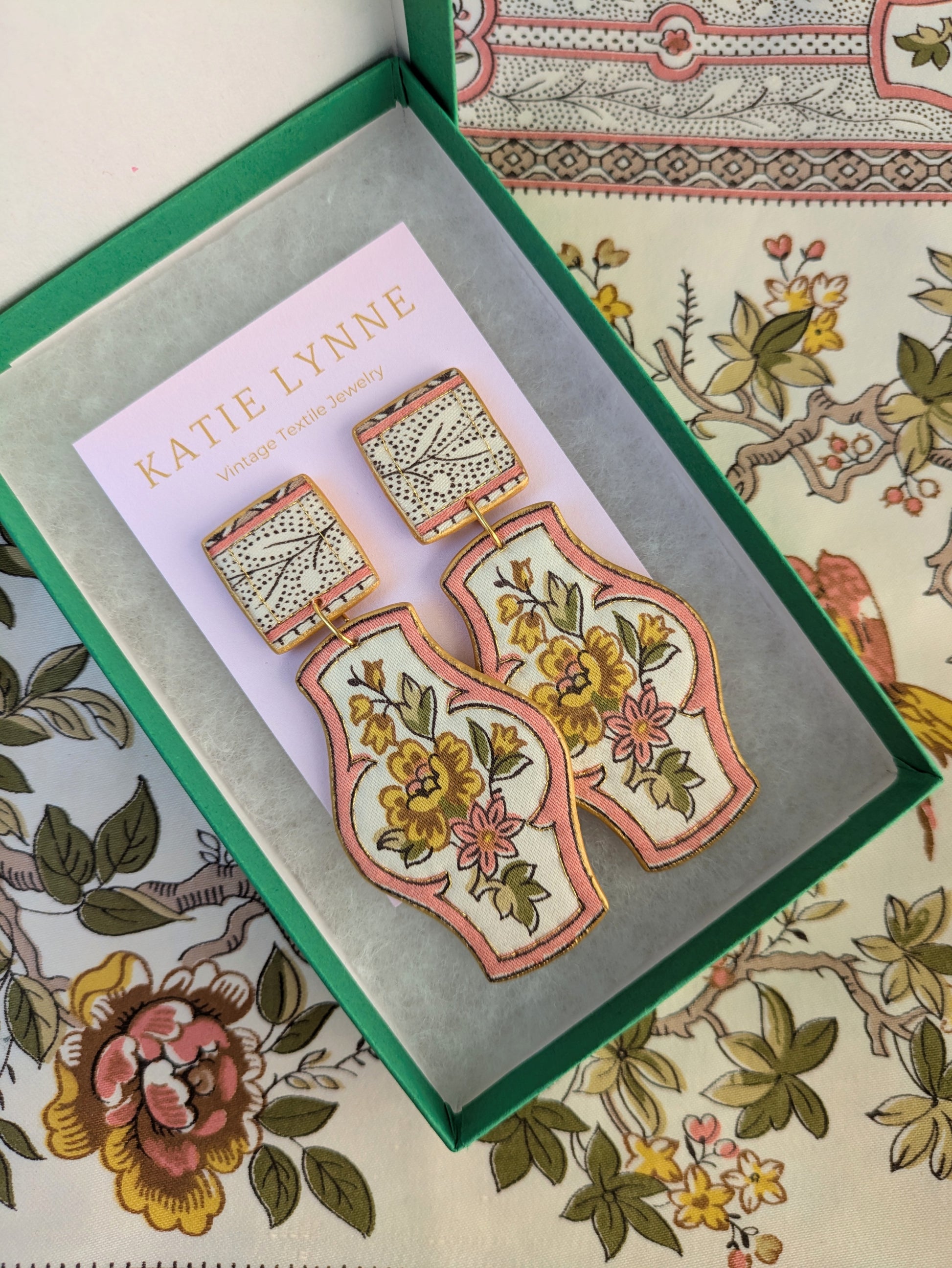 The Daphne Statement Earring was made using vintage fabric from Gahanna, Ohio. Each piece was handsewn, hand cut, and hand painted at the Katie Lynne studio in San Antonio, Texas.