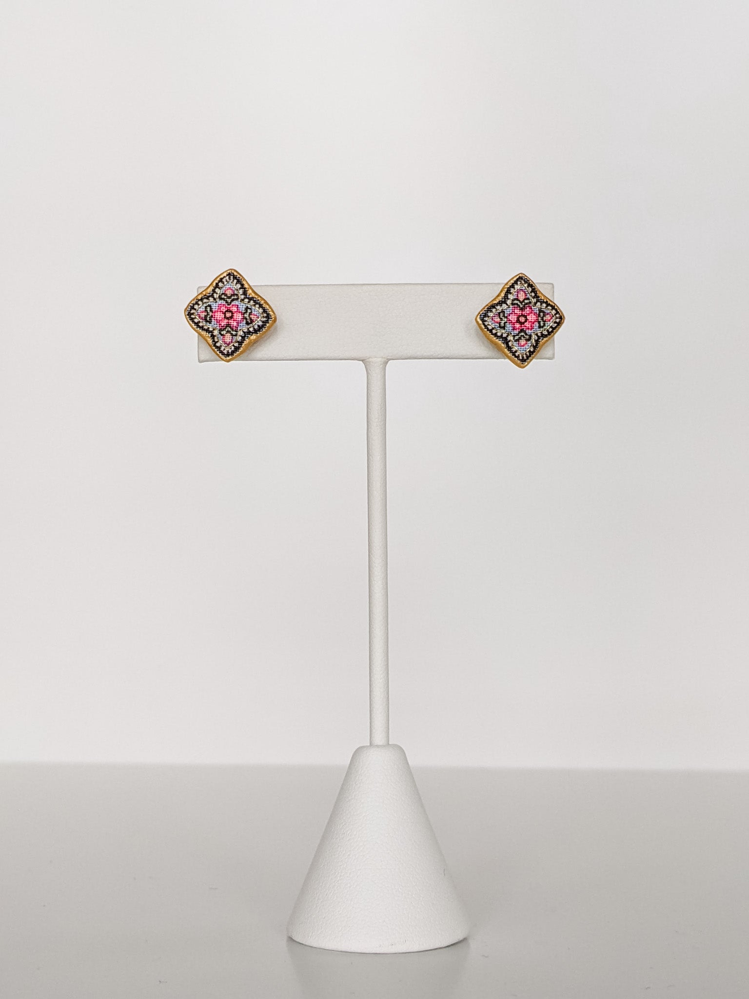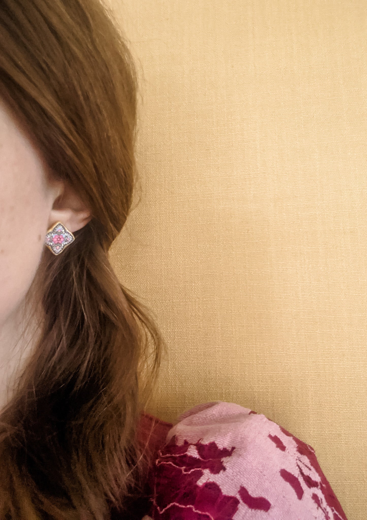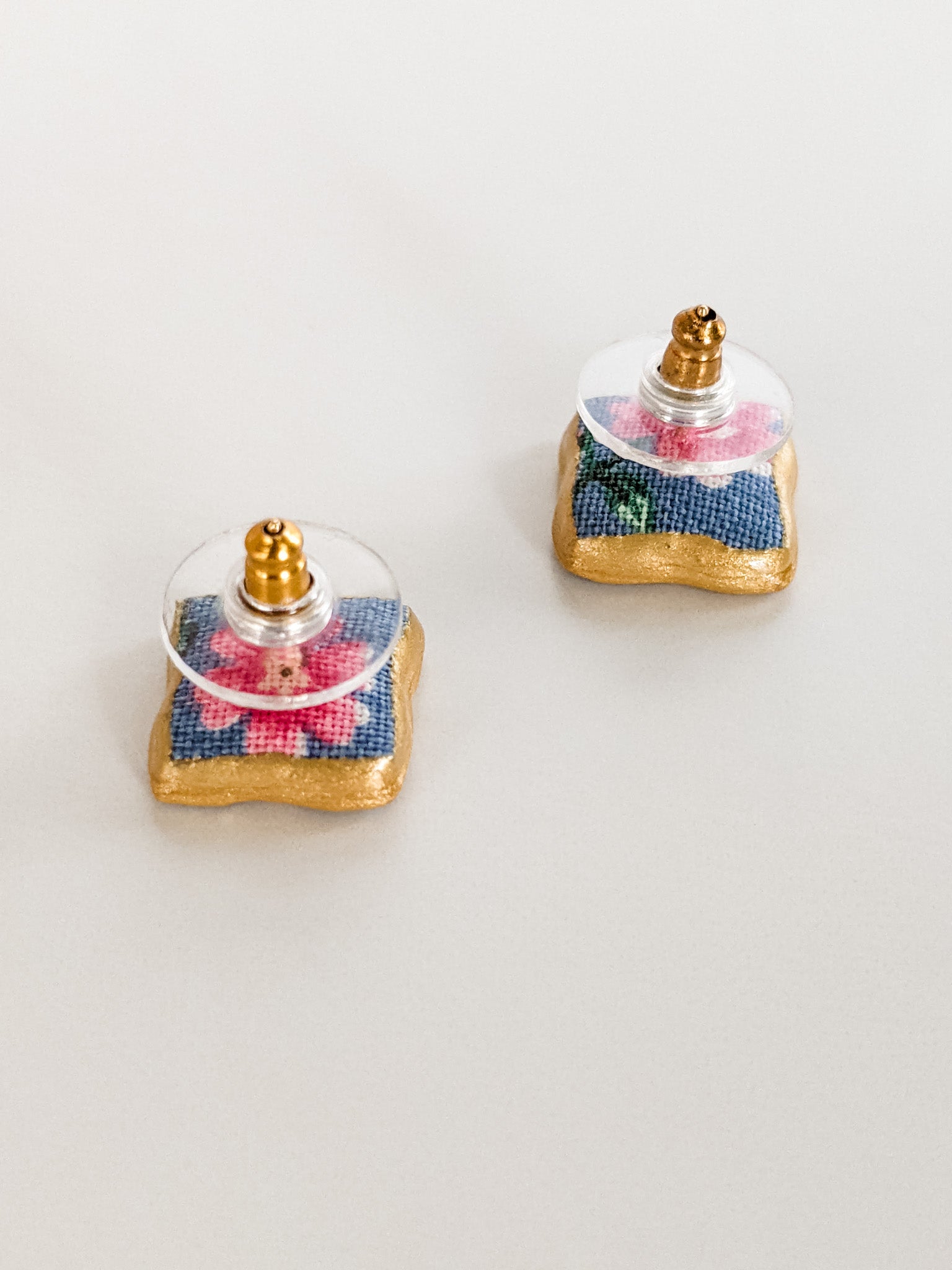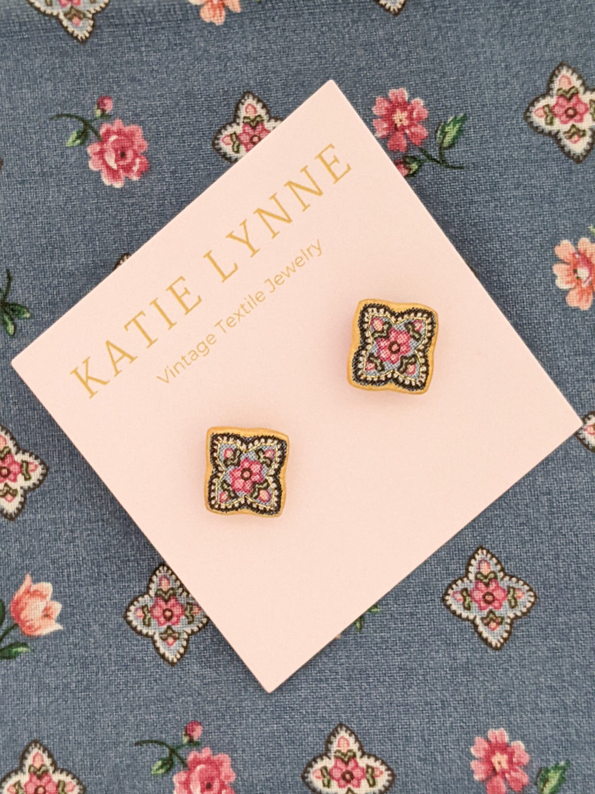 The Clementine Stud Earring was made using vintage fabric from Portland, Oregon. Each piece was handsewn, hand cut, and hand painted at the Katie Lynne studio in San Antonio, Texas.