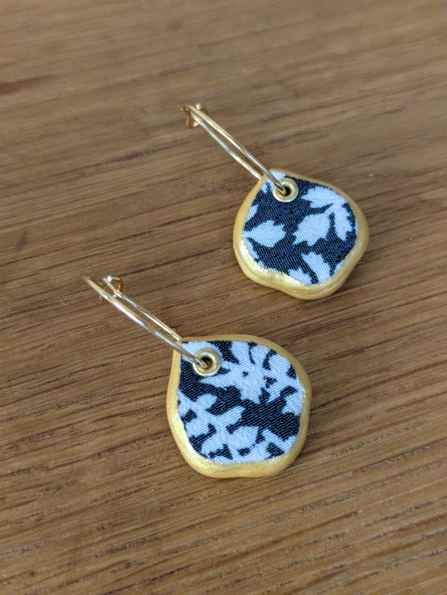 The Donna Mini Hoop Earring was made using a vintage tablecloth from Owosso, Michigan. Each earring piece was handsewn, hand cut, and hand painted at the Katie Lynne studio in San Antonio, Texas.