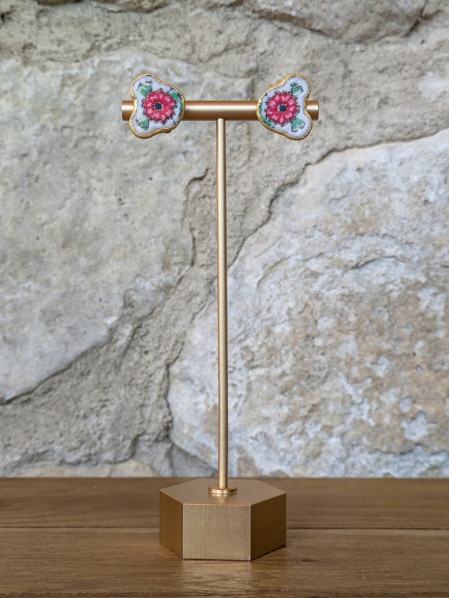 The Jane Stud Earring was made using vintage fabric from Gloucester, Virginia. Each piece was handsewn, hand cut, and hand painted at the Katie Lynne studio in San Antonio, Texas.