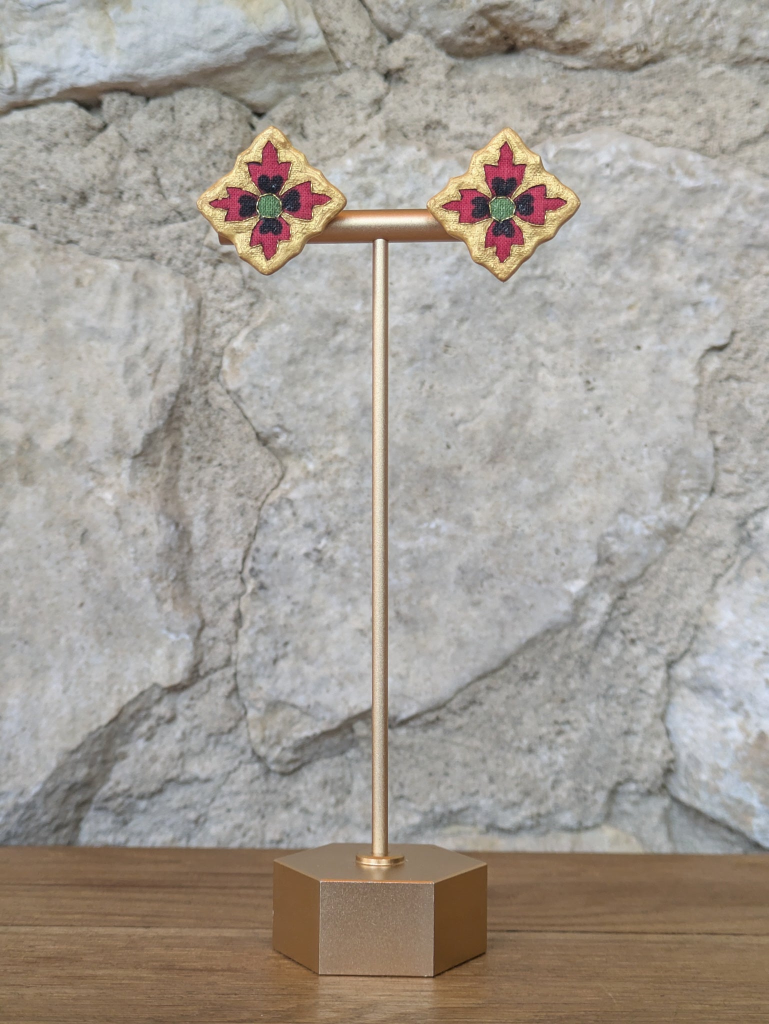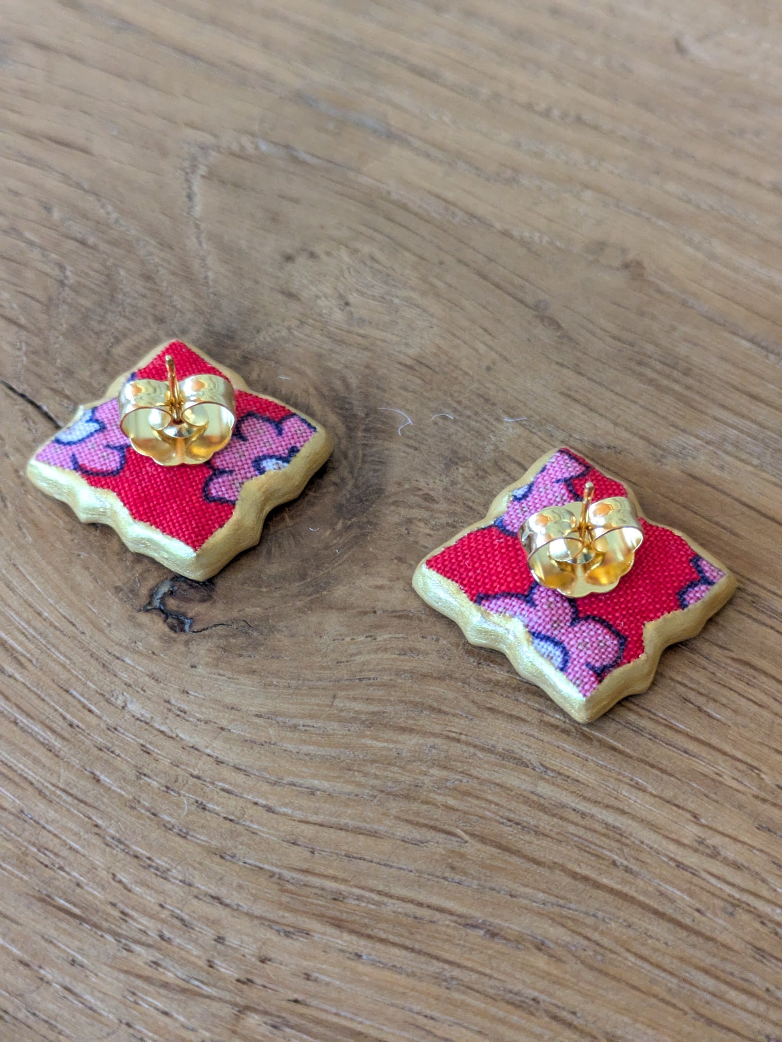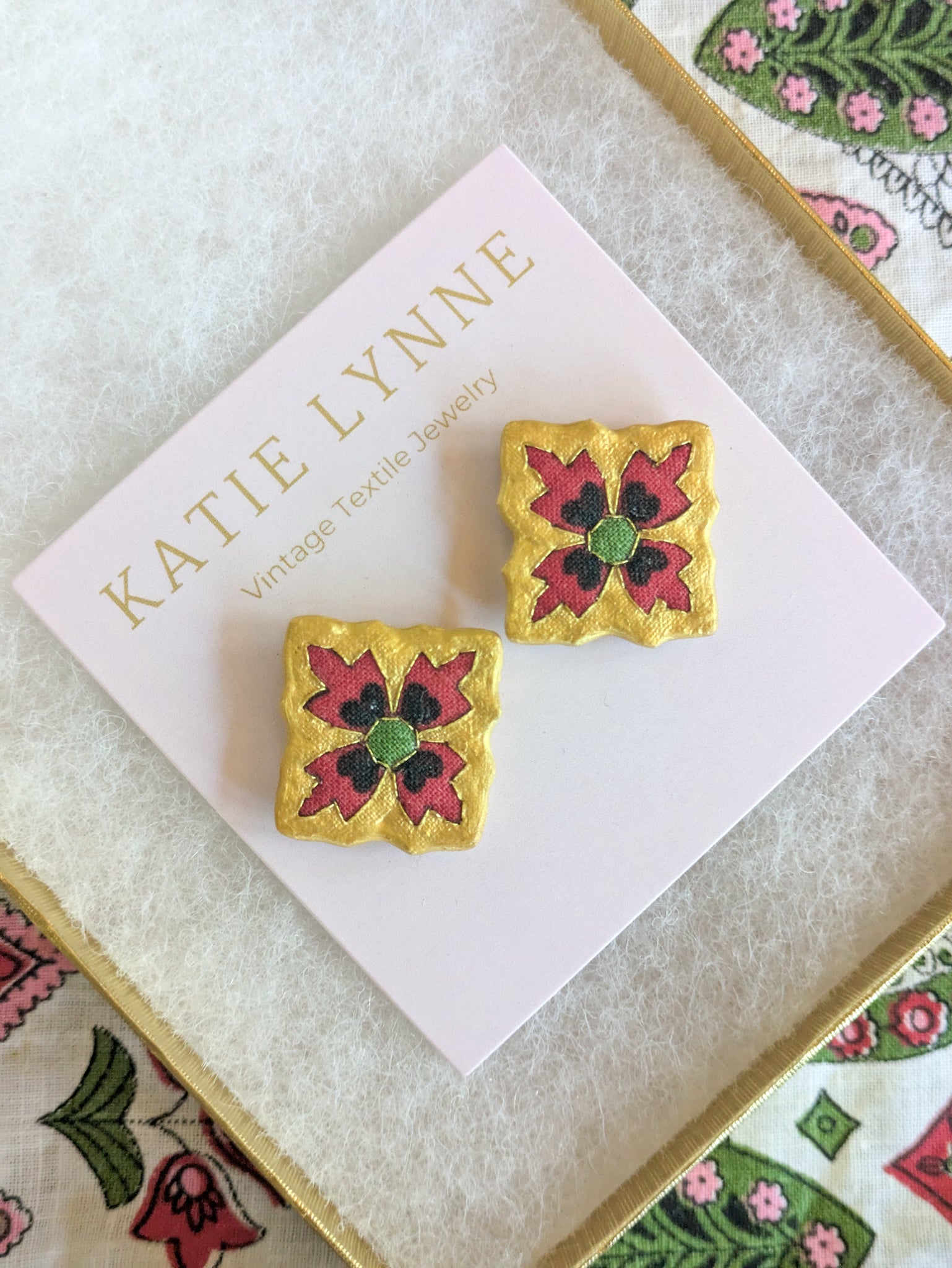 The Joy Stud Earring was made using 1950's fabric from Princeton, Wisconsin. Each piece was handsewn, hand cut, and hand painted at the Katie Lynne studio in San Antonio, Texas.